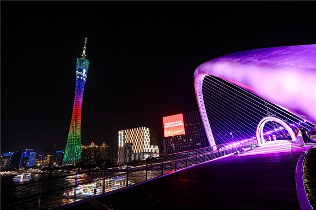 当晚的广州星光璀璨,城市地标迎来时尚新生。这是广州塔落成15年来首次迎来“灯光变装秀”,塔身流转的色彩与比音勒芬品牌元素完美呼应,宛如一件璀璨的“光影华服” 诉说着东方美学。而新晋城市地标海心桥更打破常规,第一次化身全长 198 米的临江 T 台,模特们身着比音勒芬最新系列服饰,在桥体的线条与光影中穿梭,让运动时尚与都市景观达成了前所未有的融合。